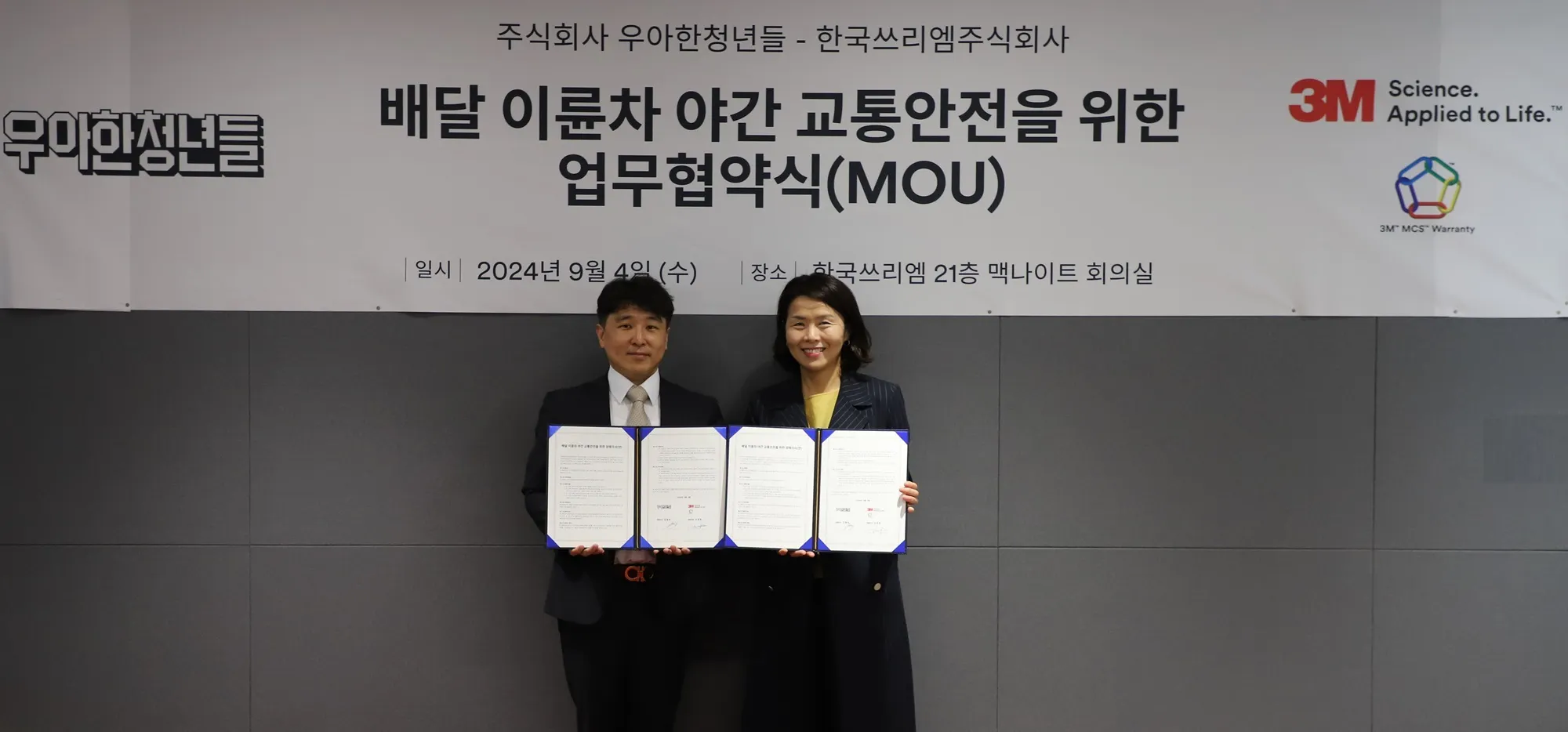 우아한청년들이 한국쓰리엠과 배달이륜차 야간 교통안전을 위한 업무협약을 체결했다. (사진 왼쪽부터) 우아한청년들 양시훈 라이더교육기획팀장, 3M 정아현 커머셜브랜딩 및 교통사업부 팀장.